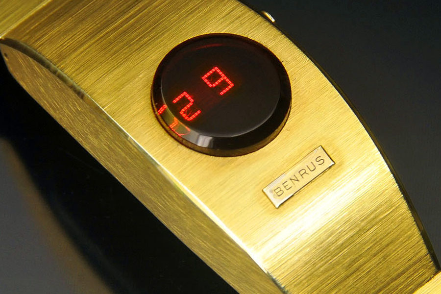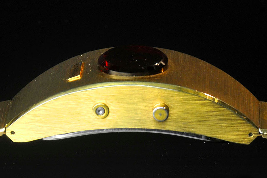 This Benrus watch uses a unique and inventive approach to fitting an LED display into a small LED watch suitable for a dainty ladies' watch. In order to reduce the size of the display to fit a watch of this size, this model uses a two digit display. When you push the time button, the watch first displays the hour, and then after a second or so, it blinks the minute. It's cute, intuitive, and unique.